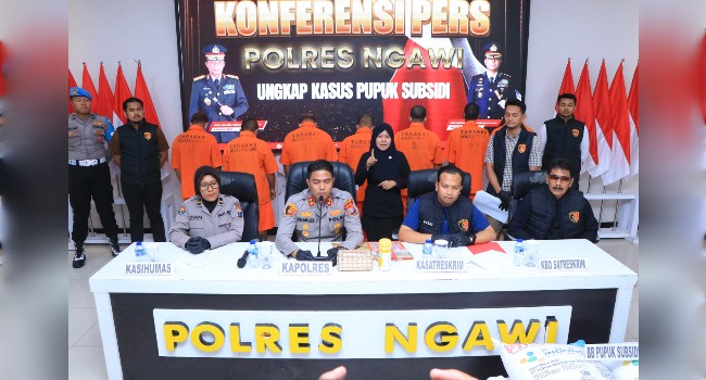 Ngawi | Polres Ngawi Polda Jawa Timur (Jatim) mengamankan 7 orang tersangka dalam kasus dugaan penjualan ilegal pupuk bersubsidi dari wilayah lain ke Kabupaten Ngawi.